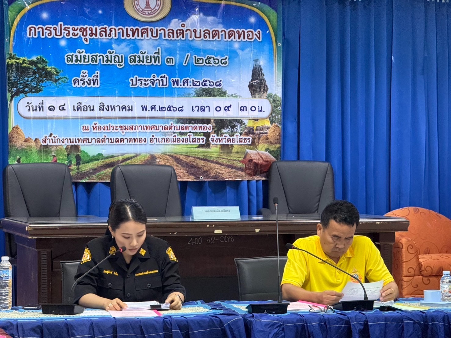 วันอังคารที่ 26 สิงหาคม พ.ศ. 2568 เวลา 13.30 น. นางสาวภัคสุนันท์ คำลือ นายกเทศมนตรีตำบลตาดทอง เป็นประธานเปิดการประชุม พร้อมด้วย ว่าที่ร้อยตรีพิชิต กันยาวรรณ ปลัดเทศบาลฯ นางสาวจันทร์ทิรา ทาระพันธ์ หัวหน้าสำนักปลัด นายประเสริฐ ชูรัตน์ ผู้อำนวยการกองช่าง ตัวแทนจากสำนักงานเกษตรจังหวัดยโสธร นางศิริพร ใบบัว พยาบาลวิชาชีพ นางสาวธนัญญาณ์ กาญจนอัครเดช นักพัฒนาชุมชน จ่าสิบเอกวิลาศ ยินงาม นักป้องกันฯ นางบุญธรรม ศรีสุวรรณ ผู้ใหญ่บ้านดอนแฮด หมู่ที่ 7(ผู้แทนประชาคม) นางอรัญญา เวชกามา ผู้ใหญ่บ้านตาดทอง หมู่ที่ 11 (ผู้แทนประชาคม) นายศักดิ์สิทธิ์ ศรีดารา ผู้ใหญ่บ้านประชาสรรค์ หมู่ที่ 12 (ผู้แทนประชาคม) เข้าร่วมการประชุมคณะกรรมการศูนย์ช่วยเหลือประชาชนเทศบาลตำบลตาดทอง โดยได้พิจารณาให้ความช่วยเหลือผู้ประสบภัยพิบัติ (วาตภัย) จำนวน 12 ราย และวาระต่อมา เรื่อง การพิจารณาให้ความช่วยเหลือผู้ขอใช้บริการรถการแพทย์ฉุกเฉิน (EMS) และรถยนต์ส่วนกลางเทศบาลตำบลตาดทอง รับ-ส่ง ตามแพทย์นัด จำนวน 6 ราย ปิดประชุมเวลา 15.35 น.