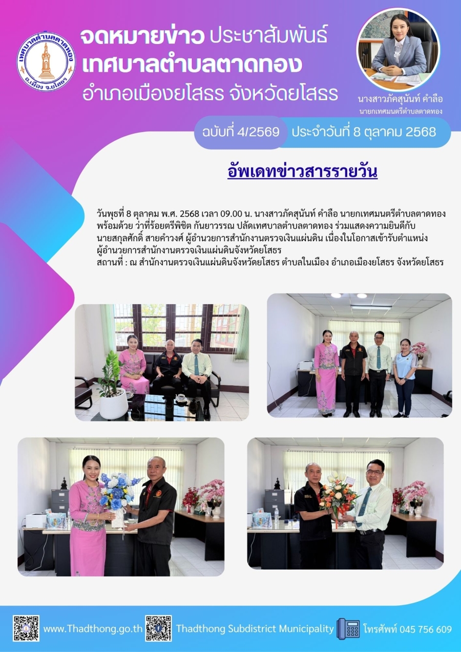 วันพุธที่ 8 ตุลาคม พ.ศ. 2568 เวลา 09.00 น. นางสาวภัคสุนันท์ คำลือ นายกเทศมนตรีตำบลตาดทอง พร้อมด้วย ว่าที่ร้อยตรีพิชิต กันยาวรรณ ปลัดเทศบาลตำบลตาดทอง ร่วมแสดงความยินดีกับนายสกุลศักดิ์ สายคำวงศ์ ผู้อำนวยการสำนักงานตรวจเงินแผ่นดิน เนื่องในโอกาสเข้ารับตำแหน่ง ผู้อำนวยการสำนักงานตรวจเงินแผ่นดินจังหวัดยโสธร