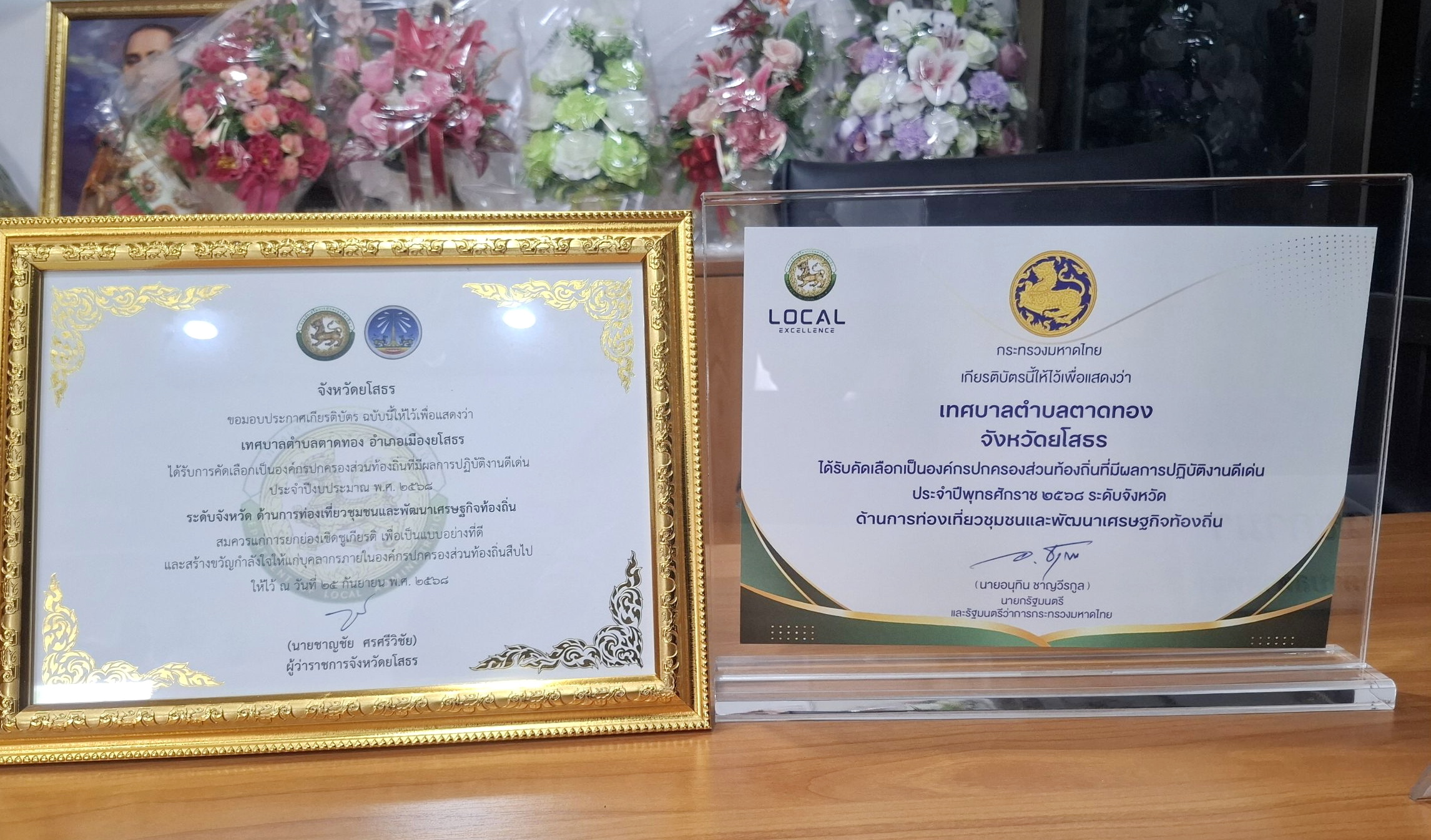 2.เทศบาลตำบลตาดทอง รับมอบใบประกาศเกียรติบัตร ระดับจังหวัด ด้านการท่องเที่ยวชุมชนและพัฒนาเศรษฐกิจท้องถิ่น