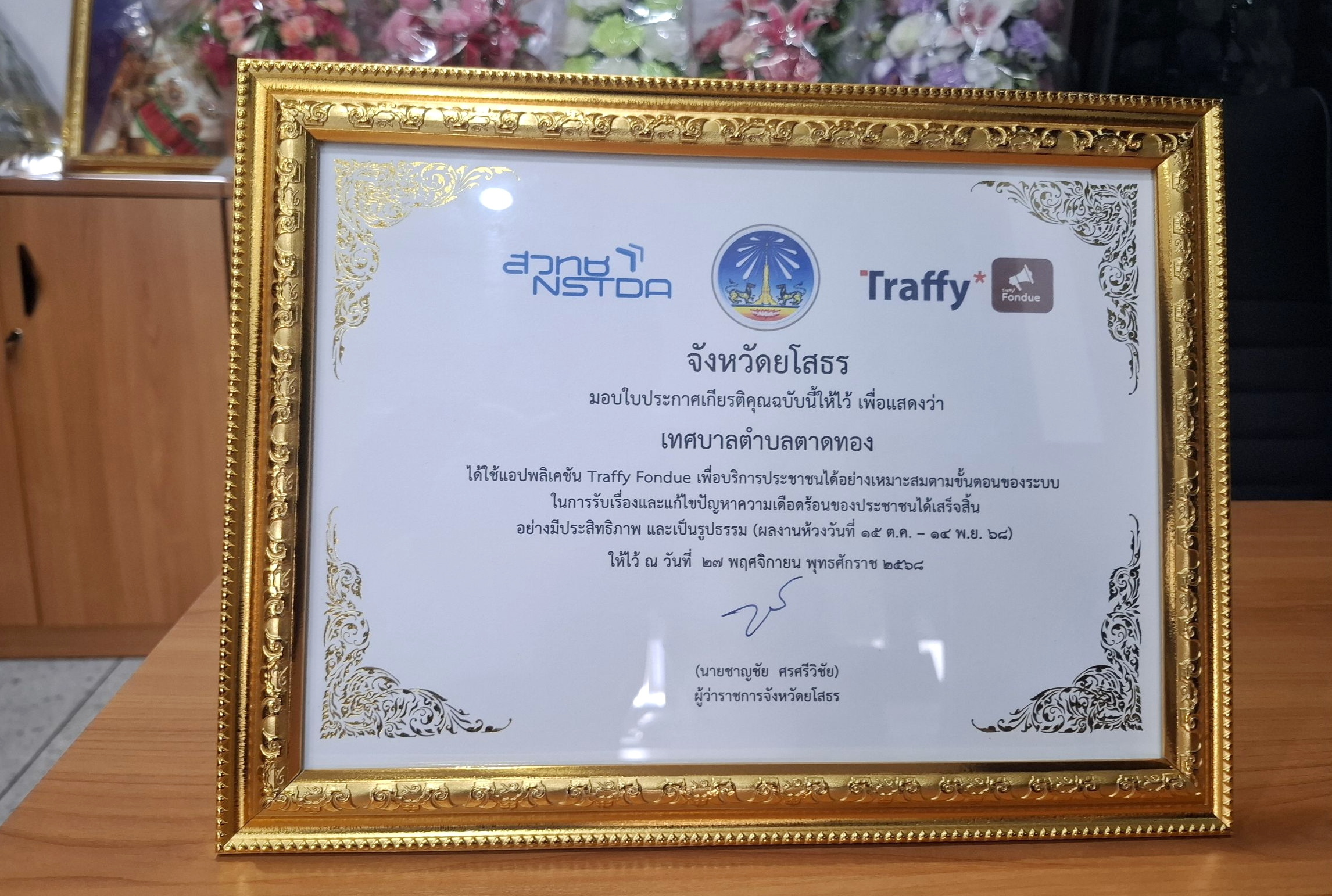 1.เทศบาลตำบลตาดทอง รับมอบใบประกาศเกียรติคุณหน่วยงานที่จัดการเรื่องร้องเรียนร้องทุกข์และปัญหาความเดือดร้อนของประชาชนด้วยแอปพลิเคชัน Traffy Fondue จังหวัดยโสธร
