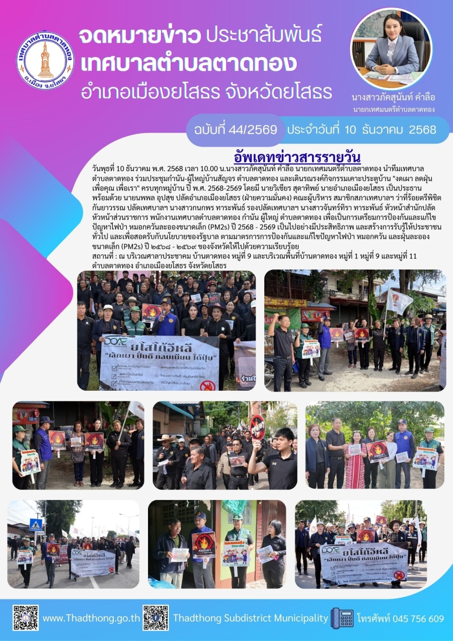 วันพุธที่ 10 ธันวาคม พ.ศ. 2568 เวลา 10.00 น.นางสาวภัคสุนันท์ คำลือ นายกเทศมนตรีตำบลตาดทอง นำทีมเทศบาลตำบลตาดทอง ร่วมประชุมกำนัน-ผู้ใหญ่บ้านสัญจร ตำบลตาดทอง และเดินรณรงค์กิจกรรมเคาะประตูบ้าน "งดเผา ลดฝุ่น เพื่อคุณ เพื่อเรา" ครบทุกหมู่บ้าน ปี พ.ศ. 2568-2569 โดยมี นายวิเชียร สุดาทิพย์ นายอำเภอเมืองยโสธร เป็นประธาน พร้อมด้วย นายนพพล อุปสุข ปลัดอำเภอเมืองยโสธร (ฝ่ายความมั่นคง) คณะผู้บริหาร สมาชิกสภาเทศบาลฯ ว่าที่ร้อยตรีพิชิต กันยาวรรณ ปลัดเทศบาลฯ นางสาวกนกพร ทาระพันธ์ รองปลัดเทศบาลฯ นางสาวจันทร์ทิรา ทาระพันธ์ หัวหน้าสำนักปลัด หัวหน้าส่วนราชการ พนักงานเทศบาลตำบลตาดทอง กำนัน ผู้ใหญ่ ตำบลตาดทอง เพื่อเป็นการเตรียมการป้องกันและแก้ไขปัญหาไฟป่า หมอกควันละอองขนาดเล็ก (PM2s) ปี 2568 - 2569 เป็นไปอย่างมีประสิทธิภาพ และสร้างการรับรู้ให้ประชาชนทั่วไป และเพื่อสอดรับกับนโยบายของรัฐบาล ตามมาตรการการป้องกันและแก้ไขปัญหาไฟป่า หมอกควัน และฝุ่นละอองขนาดเล็ก (PM2s) ปี ๒๕๖๘ - ๒๕๖๙ ของจังหวัดให้ไปด้วยความเรียบร้อย