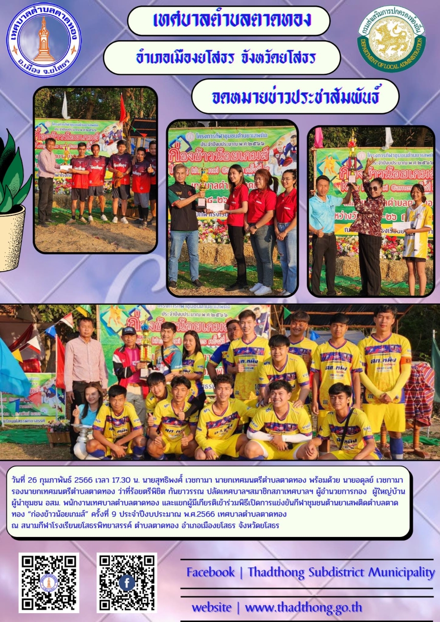 วันที่ 26 กุมภาพันธ์ 2566 เวลา 17.30 น. นายสุทธิพงศ์์ เวชกามา นายกเทศมนตรีตำบลตาดทอง พร้อมด้วย นายอดุลย์ เวชกามา รองนายกเทศมนตรีตำบลตาดทอง ว่าที่ร้อยตรีพิชิต กันยาวรรณ ปลัดเทศบาลฯสมาชิกสภาเทศบาลฯ ผู้อำนวยการกอง ผู้ใหญ่บ้าน ผู้นำชุมชน อสม. พนักงานเทศบาลตำบลตาดทอง และแขกผู้มีเกียรติเข้าร่วมพิธีปิดการแข่งขันกีฬาชุมชนต้านยาเสพติดตำบลตาดทอง “ก่องข้าวน้อยเกมส์” ครั้งที่ 9 ประจำปีงบประมาณ พ.ศ.2566 เทศบาลตำบลตาดทอง