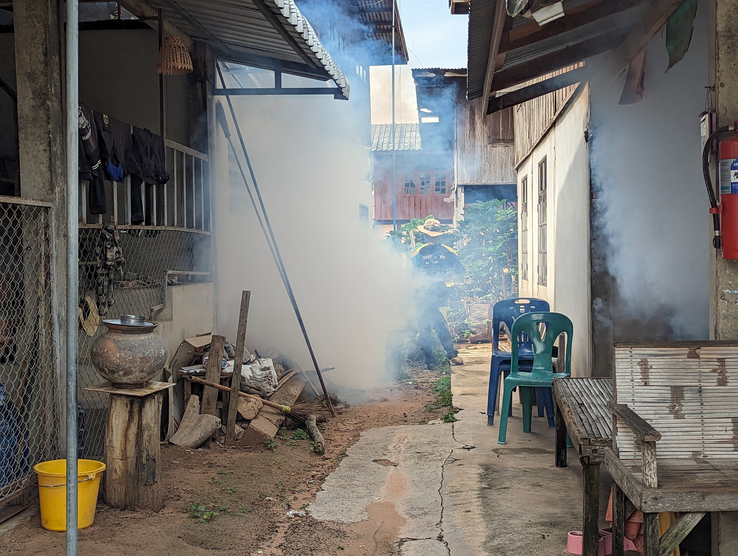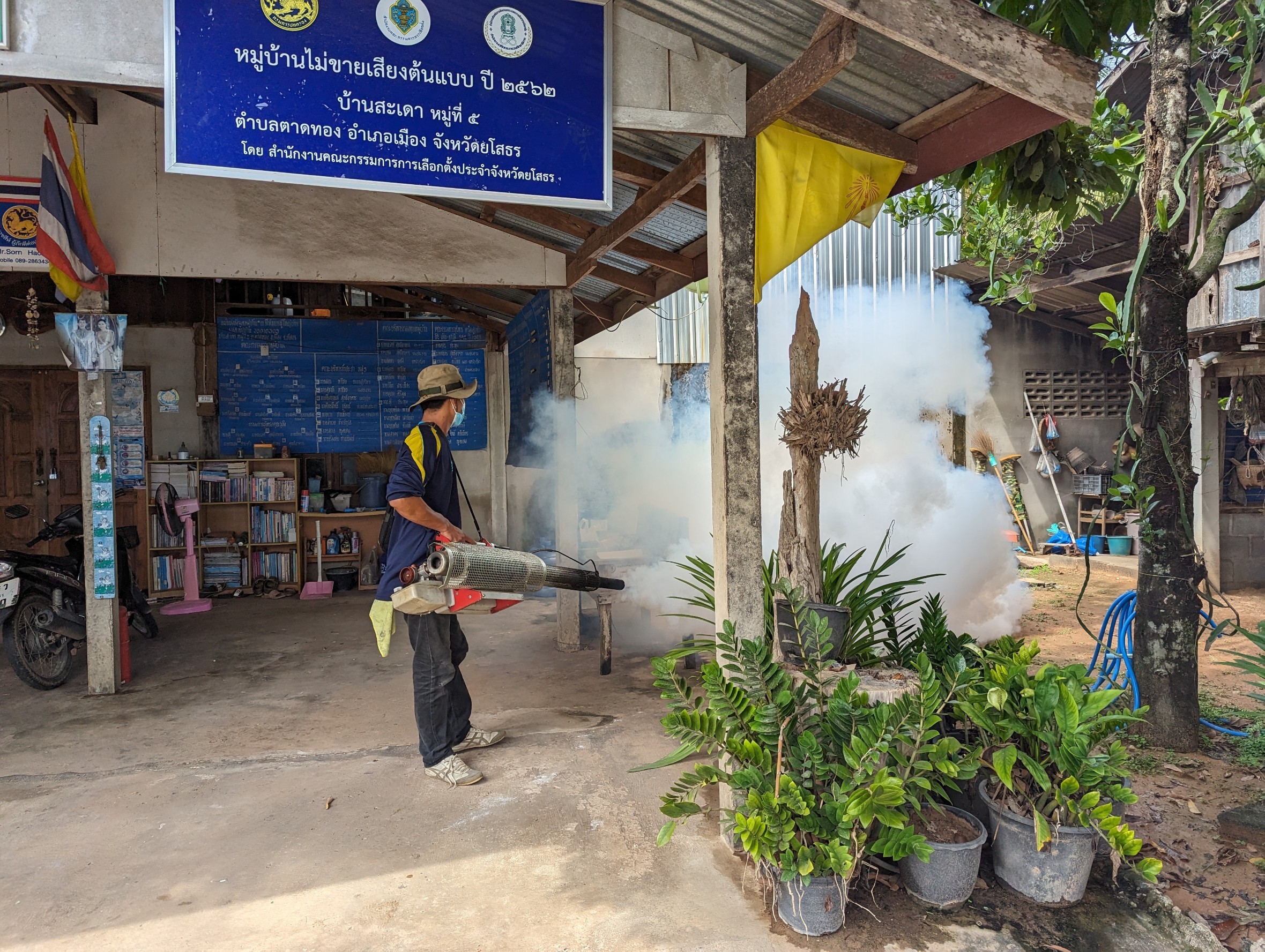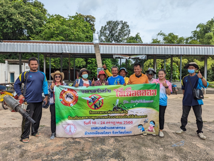 กองสาธารณสุข เทศบาลตำบลตาดทอง ร่วมกับอาสาสมัครสาธารณสุขประจำหมู่บ้านและเจ้าหน้าที่โรงพยาบาลส่งเสริมสุขภาพตำบลตาดทอง ลงพื้นที่ทำการพ่นหมอกควันเพื่อป้องกันและควบคุมการแพร่ระบาดของโรคไข้เลือดออกตำบลตาดทอง ประจำปี 2566