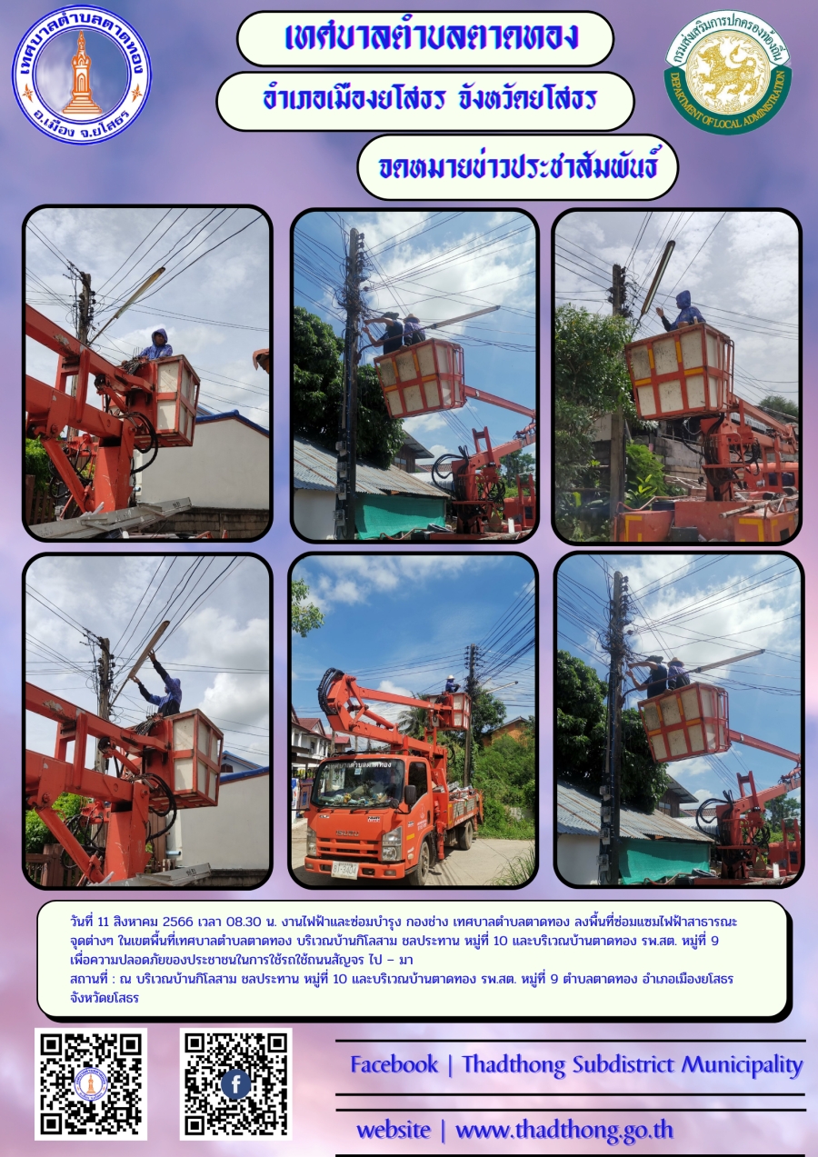กองช่าง เทศบาลตำบลตาดทอง ลงพื้นที่ซ่อมแซมไฟฟ้าสาธารณะจุดต่างๆ ในเขตพื้นที่เทศบาลตำบลตาดทอง