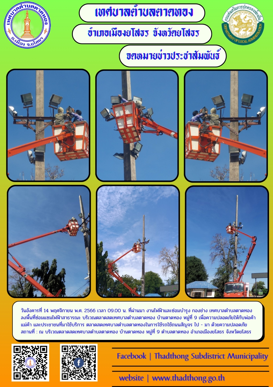 วันอังคารที่ 14 พฤศจิกายน พ.ศ. 2566 เวลา 09.00 น. ที่ผ่านมา งานไฟฟ้าและซ่อมบำรุง กองช่าง เทศบาลตำบลตาดทอง ลงพื้นที่ซ่อมแซมไฟฟ้าสาธารณะ บริเวณตลาดสดเทศบาลตำบลตาดทอง บ้านตาดทอง หมู่ที่ 9 เพื่อความปลอดภัยให้กับพ่อค้า แม่ค้า และประชาชนที่มาใช้บริการ ตลาดสดเทศบาลตำบลตาดทองในการใช้รถใช้ถนนสัญจร ไป - มา ด้วยความปลอดภัย