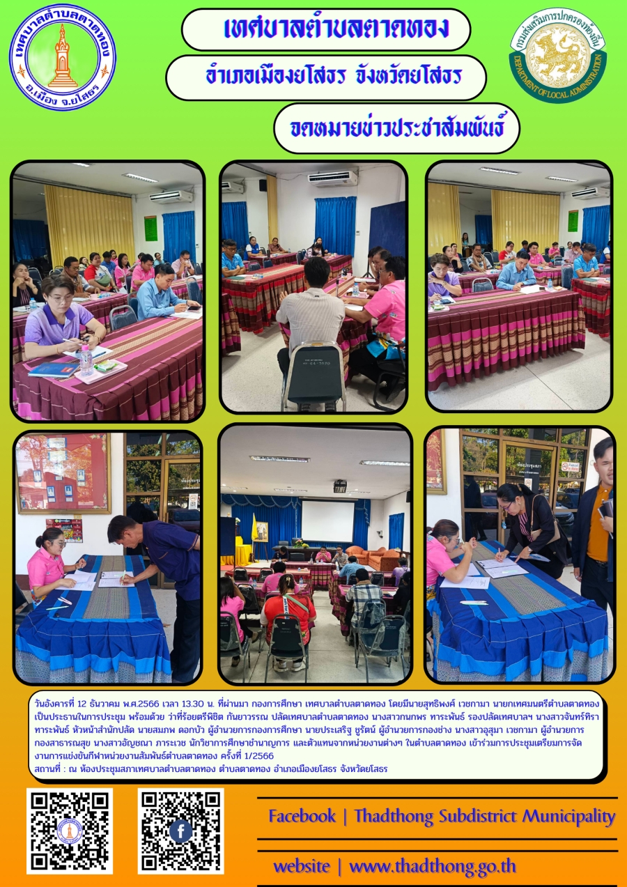 วันอังคารที่ 12 ธันวาคม พ.ศ.2566 เวลา 13.30 น. ที่ผ่านมา กองการศึกษา เทศบาลตำบลตาดทอง โดยมีนายสุทธิพงศ์ เวชกามา นายกเทศมนตรีตำบลตาดทอง เป็นประธานในการประชุม พร้อมด้วย ว่าที่ร้อยตรีพิชิต กันยาวรรณ ปลัดเทศบาลตำบลตาดทอง นางสาวกนกพร ทาระพันธ์ รองปลัดเทศบาลฯ นางสาวจันทร์ทิรา ทาระพันธ์ หัวหน้าสำนักปลัด นายสมภพ ดอกบัว ผู้อำนวยการกองการศึกษา นายประเสริฐ ชูรัตน์ ผู้อำนวยการกองช่าง นางสาวอุสุมา เวชกามา ผู้อำนวยการกองสาธารณสุข นางสาวอัญชณา ภาระเวช นักวิชาการศึกษาชำนาญการ และตัวแทนจากหน่วยงานต่างๆ ในตำบลตาดทอง เข้าร่วมการประชุมเตรียมการจัดงานการแข่งขันกีฬาหน่วยงานสัมพันธ์ตำบลตาดทอง ครั้งที่1/2566