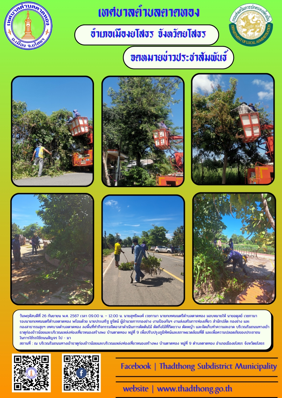 วันพฤหัสบดีที่ 26 กันยายน พ.ศ. 2567 เวลา 09.00 น. – 12.00 น. นายสุทธิพงศ์ เวชกามา นายกเทศมนตรีตำบลตาดทอง มอบหมายให้ นายอดุลย์ เวชกามา รองนายกเทศมนตรีตำบลตาดทอง พร้อมด้วย นายประเสริฐ ชูรัตน์ ผู้อำนวยการกองช่าง งานป้องกันฯ งานส่งเสริมการท่องเที่ยว สำนักปลัด กองช่าง และกองสาธารณสุขฯ เทศบาลตำบลตาดทอง ลงพื้นที่ทำกิจกรรมจิตอาสาดำเนินการตัดต้นไม้ ตัดกิ่งไม้ที่กีดขวาง ตัดหญ้า และจัดเก็บทำความสะอาด บริเวณริมถนนทางเข้าธาตุก่องข้าวน้อยและบริเวณแหล่งท่องเที่ยวหนองสร้างพง บ้านตาดทอง หมู่ที่ 9 เพื่อปรับปรุงภูมิทัศน์และสภาพแวดล้อมที่ดี และเพื่อความปลอดภัยของประชาชนในการใช้รถใช้ถนนสัญจร ไป - มา