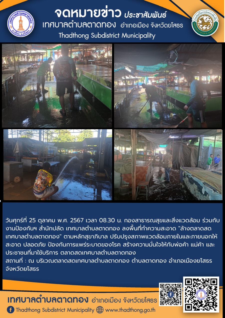 วันศุกร์ที่ 25 ตุลาคม พ.ศ. 2567 เวลา 08.30 น. กองสาธารณสุขและสิ่งแวดล้อม ร่วมกับงานป้องกันฯ สำนักปลัด เทศบาลตำบลตาดทอง ลงพื้นที่ทำความสะอาด "ล้างตลาดสดเทศบาลตำบลตาดทอง" ตามหลักสุขาภิบาล ปรับปรุงสภาพแวดล้อมภายในและภายนอกให้สะอาด ปลอดภัย ป้องกันการแพร่ระบาดของโรค สร้างความมั่นใจให้กับพ่อค้า แม่ค้า และประชาชนที่มาใช้บริการ ตลาดสดเทศบาลตำบลตาดทอง
