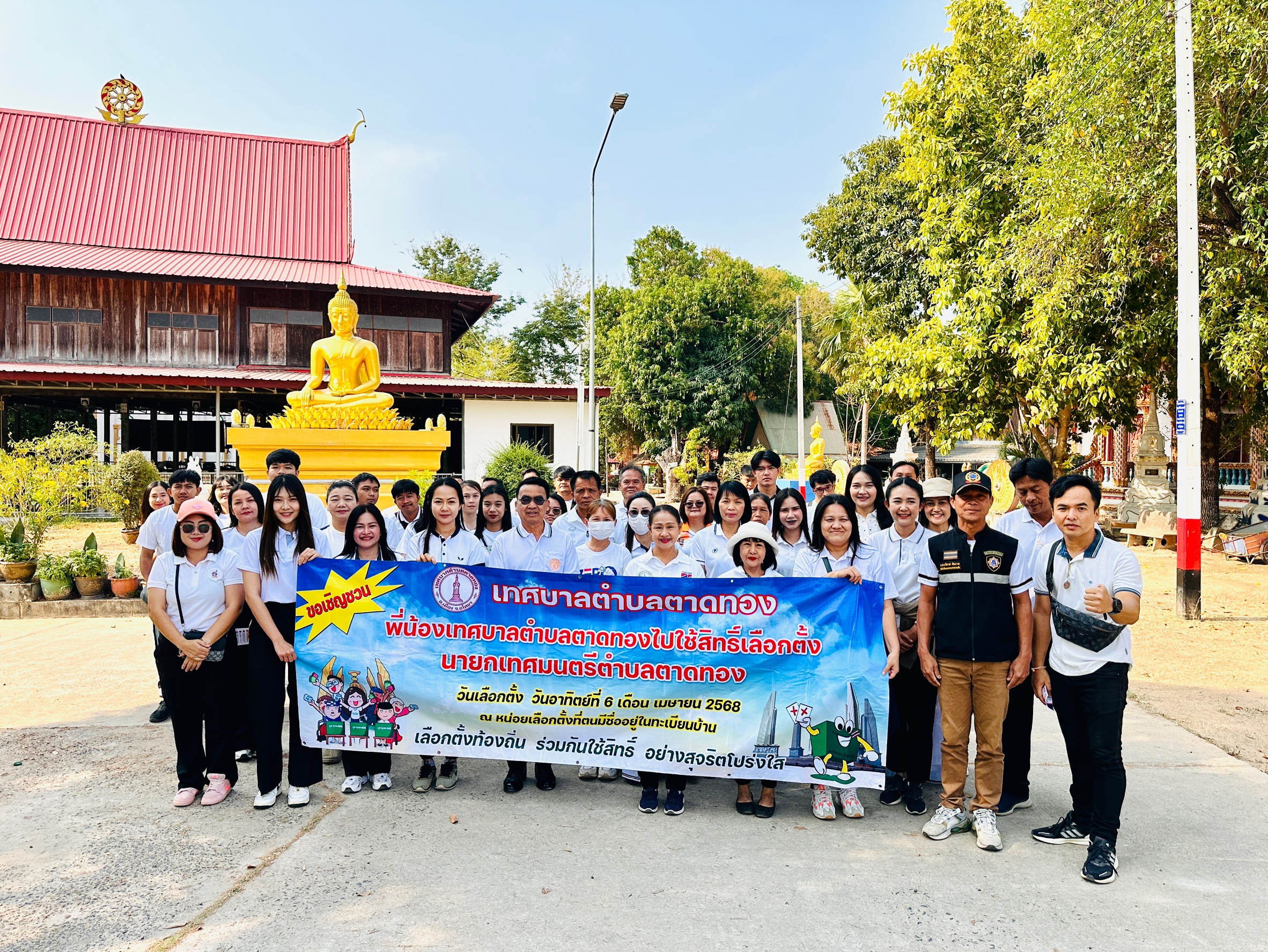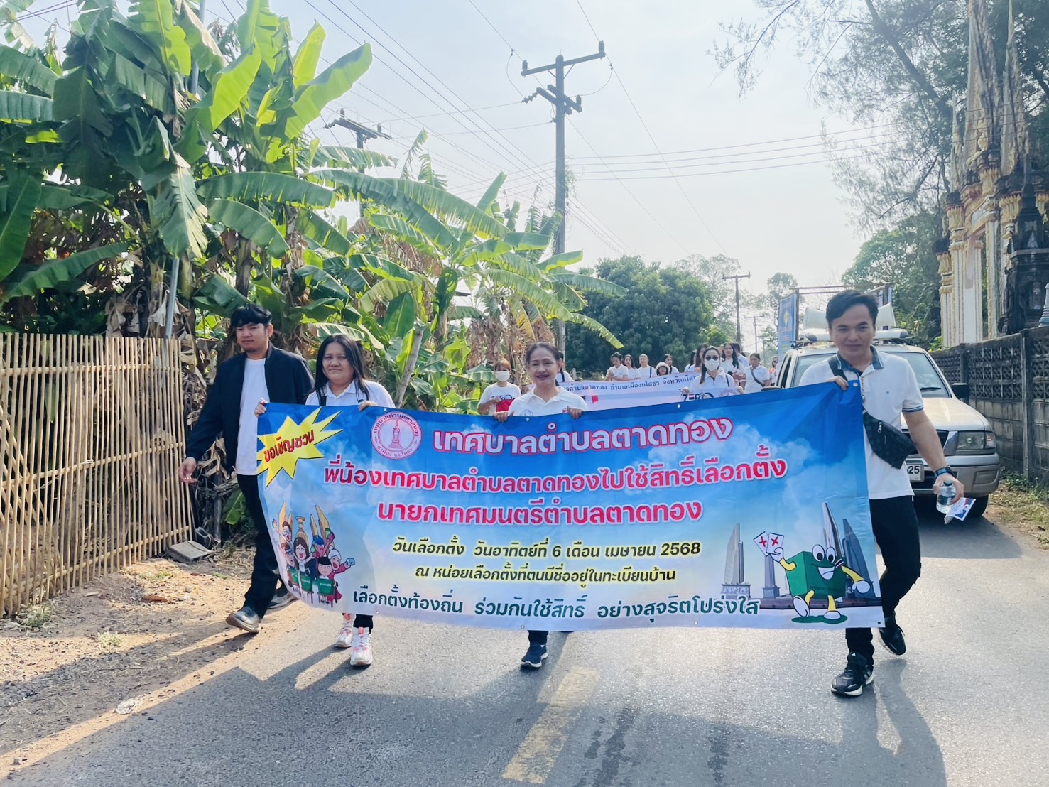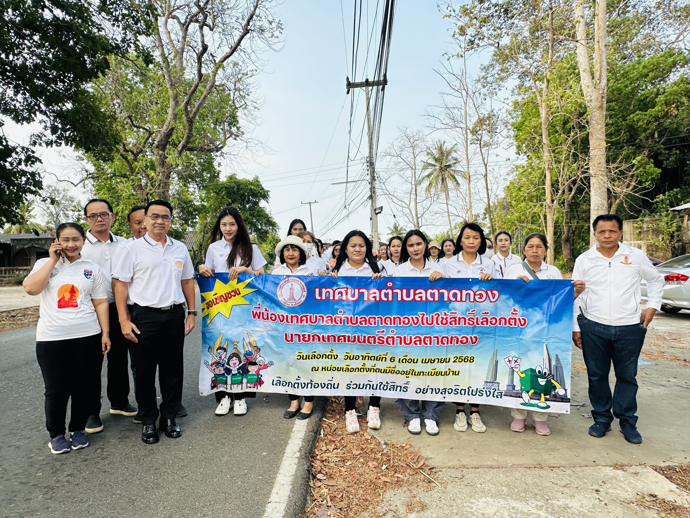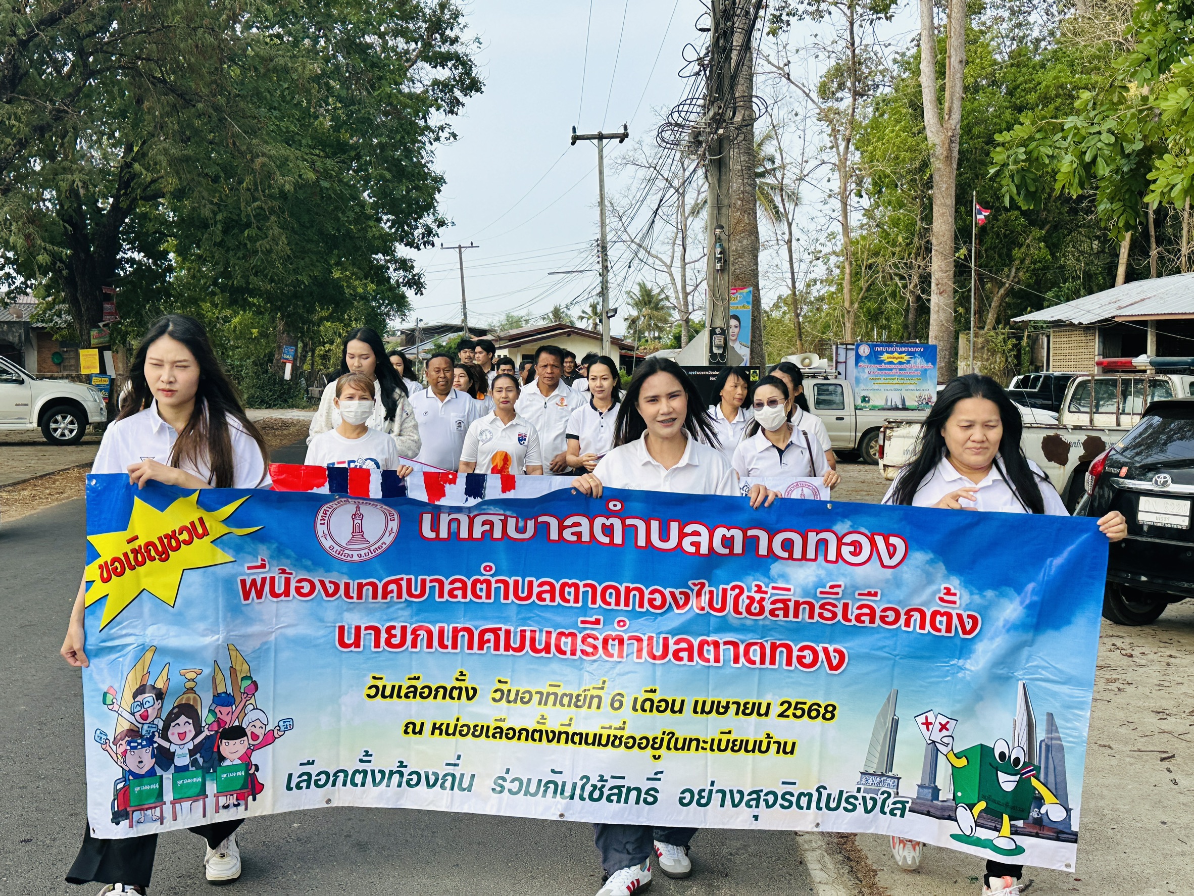 วันจันทร์ที่ 17 มีนาคม พ.ศ. 2568 เวลา 08.00 น. – 09.30 น. เทศบาลตำบลตาดทอง นำโดยว่าที่ร้อยตรี ดร.พิชิต กันยาวรรณ ปลัดเทศบาลฯ ปฏิบัติหน้าที่ นายกเทศมนตรีตำบลตาดทอง พร้อมด้วย นางสาวกนกพร ทาระพันธ์ รองปลัดเทศบาลฯ หัวหน้าส่วนราชการ นายสุริยา สุวรรณเพ็ชร ผู้ใหญ่บ้านสะเดา หมู่ที่ 5 นางพรรณปพร เชื้อบัณฑิต สารวัตรกำนัน หมู่ที่ 10 นายธีรการต์ สุทธิอาคาร ผู้ช่วยผู้ใหญ่บ้านสะเดา หมู่ที่ 5 นายไกรสิทธิ์ ชูรัตน์ ผู้ช่วยผู้ใหญ่บ้านสะเดา หมู่ที่ 5 นางจันทร์เพ็ญ พรมศรี ผู้ช่วยผู้ใหญ่บ้านสะเดา หมู่ที่ 6 นายนภดล ประเสริฐ ผู้ช่วยผู้ใหญ่บ้านสะเดา หมู่ที่ 6 และพนักงานเทศบาลตำบลตาดทอง ร่วมเดินรณรงค์เพื่อเชิญชวนประชาสัมพันธ์การเลือกตั้งให้ประชาชนในพื้นที่ออกมาใช้สิทธิเลือกตั้ง ไม่นอนหลับทับสิทธิ์ ไม่ซื้อสิทธิขายเสียง ส่งเสริมการเลือกตั้งสุจริต โปร่งใส โดยได้กำหนดวันเลือกตั้งขึ้นในวันอาทิตย์ที่ 6 เมษายน 2568 ตั้งแต่เวลา 08.00 น. ถึงเวลา 17.00 น. ณ สถานที่เลือกตั้งตามหน่วยเลือกตั้งที่ตนมีชื่ออยู่ในทะเบียนบ้าน