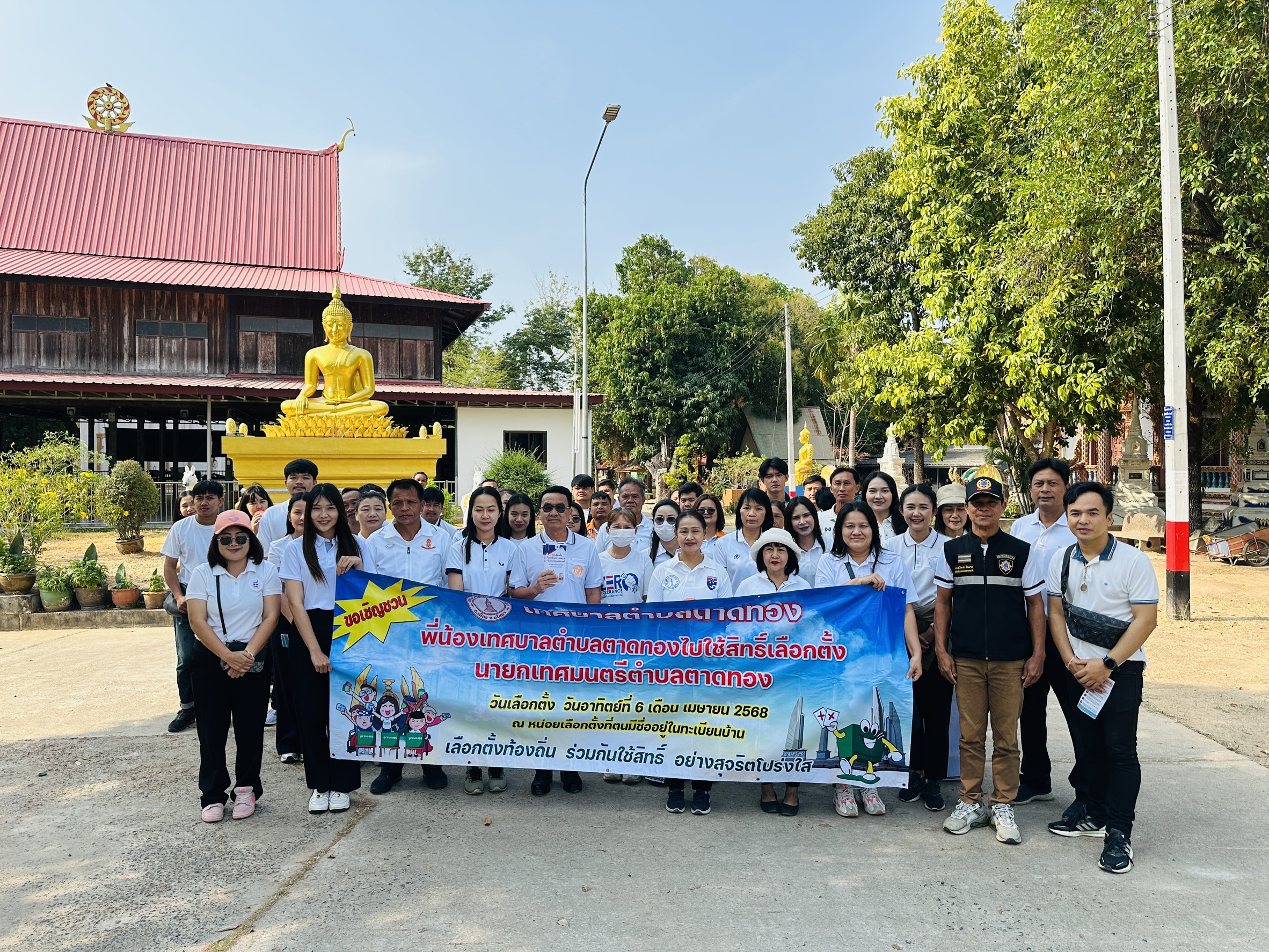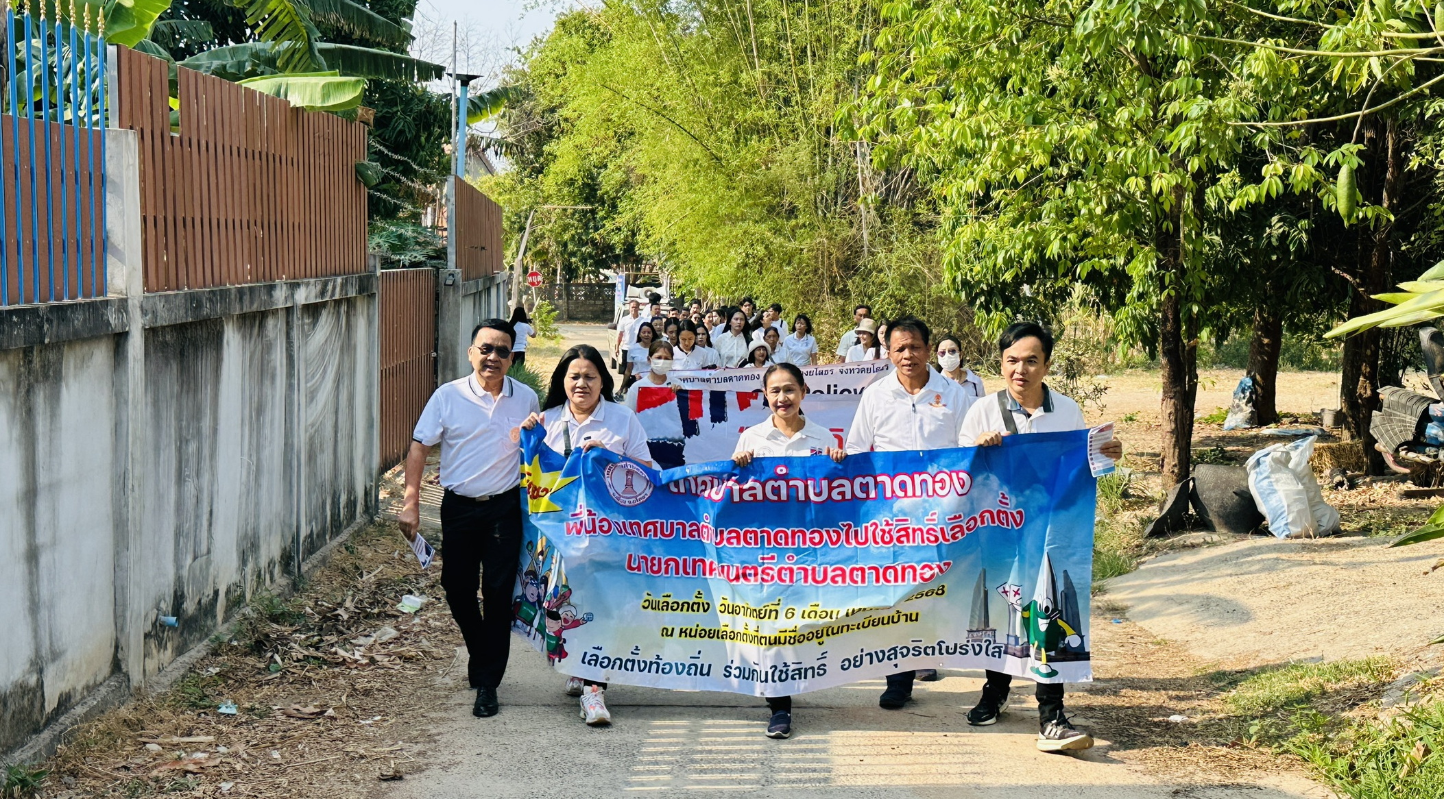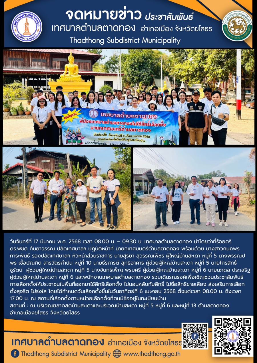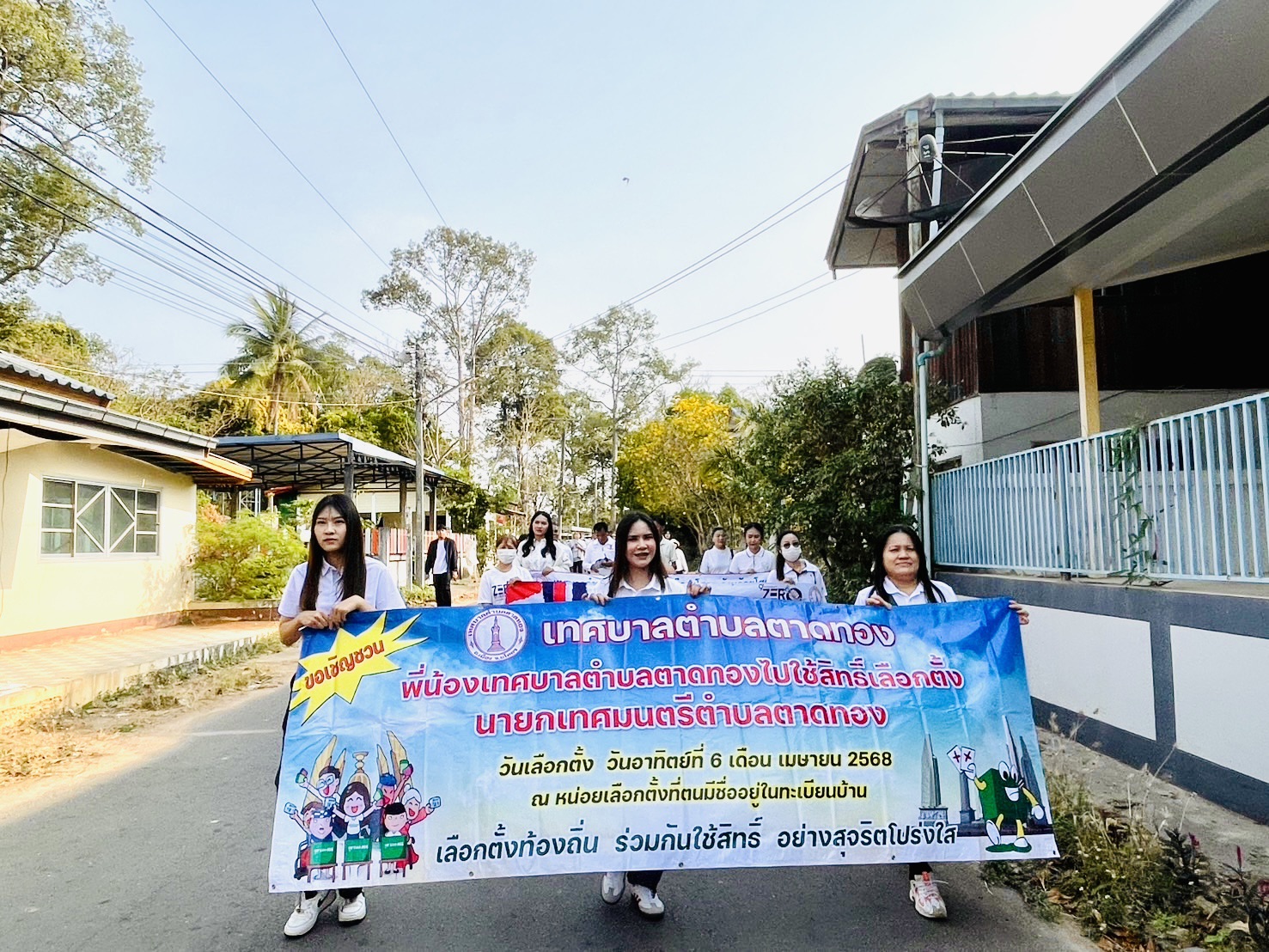 วันจันทร์ที่ 17 มีนาคม พ.ศ. 2568 เวลา 08.00 น. – 09.30 น. เทศบาลตำบลตาดทอง นำโดยว่าที่ร้อยตรี ดร.พิชิต กันยาวรรณ ปลัดเทศบาลฯ ปฏิบัติหน้าที่ นายกเทศมนตรีตำบลตาดทอง พร้อมด้วย นางสาวกนกพร ทาระพันธ์ รองปลัดเทศบาลฯ หัวหน้าส่วนราชการ นายสุริยา สุวรรณเพ็ชร ผู้ใหญ่บ้านสะเดา หมู่ที่ 5 นางพรรณปพร เชื้อบัณฑิต สารวัตรกำนัน หมู่ที่ 10 นายธีรการต์ สุทธิอาคาร ผู้ช่วยผู้ใหญ่บ้านสะเดา หมู่ที่ 5 นายไกรสิทธิ์ ชูรัตน์ ผู้ช่วยผู้ใหญ่บ้านสะเดา หมู่ที่ 5 นางจันทร์เพ็ญ พรมศรี ผู้ช่วยผู้ใหญ่บ้านสะเดา หมู่ที่ 6 นายนภดล ประเสริฐ ผู้ช่วยผู้ใหญ่บ้านสะเดา หมู่ที่ 6 และพนักงานเทศบาลตำบลตาดทอง ร่วมเดินรณรงค์เพื่อเชิญชวนประชาสัมพันธ์การเลือกตั้งให้ประชาชนในพื้นที่ออกมาใช้สิทธิเลือกตั้ง ไม่นอนหลับทับสิทธิ์ ไม่ซื้อสิทธิขายเสียง ส่งเสริมการเลือกตั้งสุจริต โปร่งใส โดยได้กำหนดวันเลือกตั้งขึ้นในวันอาทิตย์ที่ 6 เมษายน 2568 ตั้งแต่เวลา 08.00 น. ถึงเวลา 17.00 น. ณ สถานที่เลือกตั้งตามหน่วยเลือกตั้งที่ตนมีชื่ออยู่ในทะเบียนบ้าน