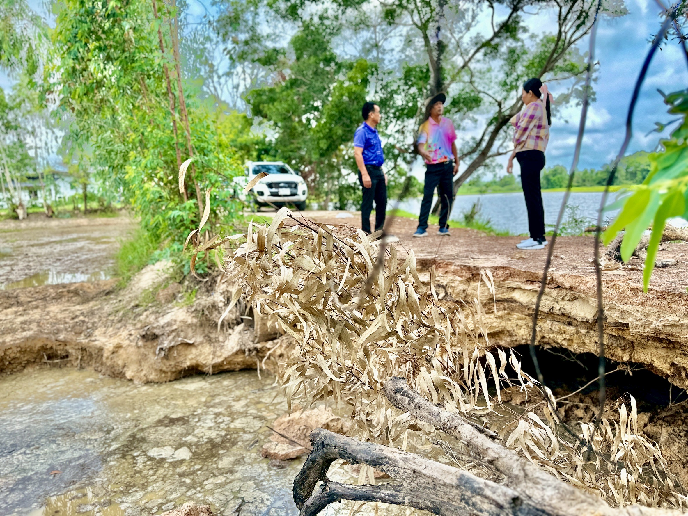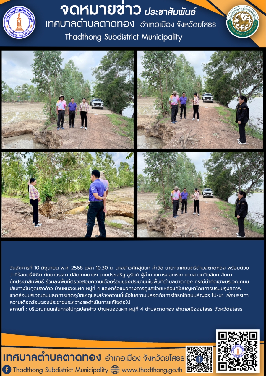 วันอังคารที่ 10 มิถุนายน พ.ศ. 2568 เวลา 10.30 น. นางสาวภัคสุนันท์ คำลือ นายกเทศมนตรีตำบลตาดทอง พร้อมด้วย ว่าที่ร้อยตรีพิชิต กันยาวรรณ ปลัดเทศบาลฯ นายประเสริฐ ชูรัตน์ ผู้อำนวยการกองช่าง นางสาวศวิตฉันท์ จันทา นักประชาสัมพันธ์ ร่วมลงพื้นที่ตรวจสอบความเดือดร้อนของประชาชนในพื้นที่ตำบลตาดทอง กรณีน้ำกัดเซาะบริเวณถนนเส้นทางไปกุดปลาค้าว บ้านหนองแฝก หมู่ที่ 4 และหารือแนวทางการดูแลช่วยเหลือแก้ไขปัญหาโดยการปรับปรุงสภาพแวดล้อมบริเวณถนนลดการเกิดอุบัติเหตุและสร้างความมั่นใจในความปลอดภัยการใช้รถใช้ถนนสัญจร ไป-มา เพื่อบรรเทาความเดือดร้อนของประชาชนระหว่างรอดำเนินการแก้ไขต่อไป