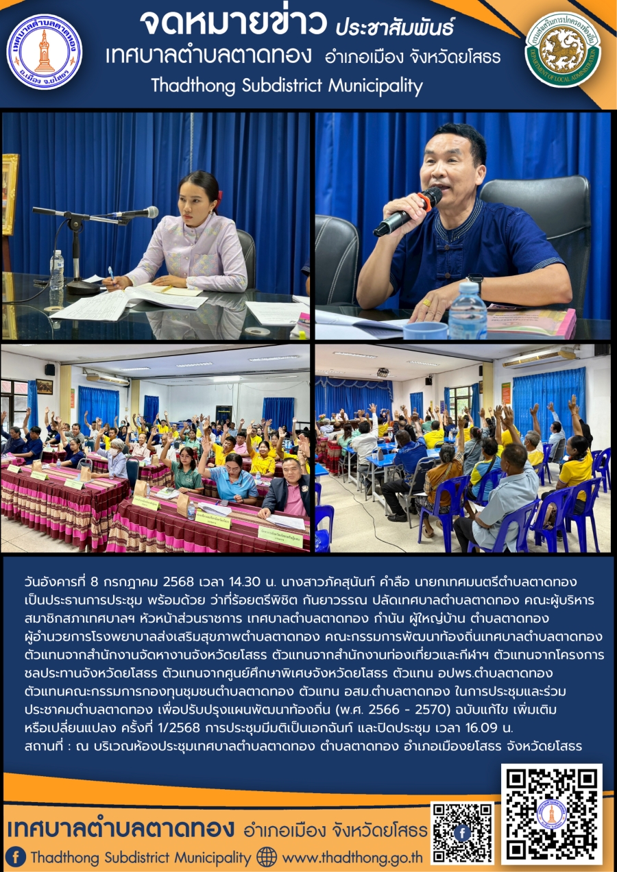 วันอังคารที่ 8 กรกฎาคม 2568 เวลา 14.30 น. นางสาวภัคสุนันท์ คำลือ นายกเทศมนตรีตำบลตาดทอง เป็นประธานการประชุม พร้อมด้วย ว่าที่ร้อยตรีพิชิต กันยาวรรณ ปลัดเทศบาลตำบลตาดทอง คณะผู้บริหาร สมาชิกสภาเทศบาลฯ หัวหน้าส่วนราชการ เทศบาลตำบลตาดทอง กำนัน ผู้ใหญ่บ้าน ตำบลตาดทอง ผู้อำนวยการโรงพยาบาลส่งเสริมสุขภาพตำบลตาดทอง คณะกรรมการพัฒนาท้องถิ่นเทศบาลตำบลตาดทอง ตัวแทนจากสำนักงานจัดหางานจังหวัดยโสธร ตัวแทนจากสำนักงานท่องเที่ยวและกีฬาฯ ตัวแทนจากโครงการชลประทานจังหวัดยโสธร ตัวแทนจากศูนย์ศึกษาพิเศษจังหวัดยโสธร ตัวแทน อปพร.ตำบลตาดทอง ตัวแทนคณะกรรมการกองทุนชุมชนตำบลตาดทอง ตัวแทน อสม.ตำบลตาดทอง ในการประชุมและร่วมประชาคมตำบลตาดทอง เพื่อปรับปรุงแผนพัฒนาท้องถิ่น (พ.ศ. 2566 - 2570) ฉบับแก้ไข เพิ่มเติมหรือเปลี่ยนแปลง ครั้งที่ 1/2568 การประชุมมีมติเป็นเอกฉันท์ และปิดประชุม เวลา 16.09 น.