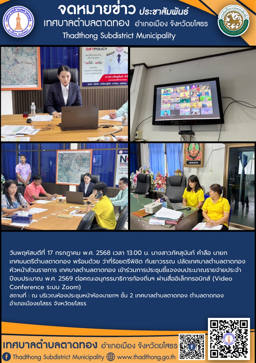 วันพฤหัสบดีที่ 17 กรกฎาคม พ.ศ. 2568 เวลา 13.00 น. นางสาวภัคสุนันท์ คำลือ นายกเทศมนตรีตำบลตาดทอง พร้อมด้วย ว่าที่ร้อยตรีพิชิต กันยาวรรณ ปลัดเทศบาลตำบลตาดทอง หัวหน้าส่วนราชการ เทศบาลตำบลตาดทอง เข้าร่วมการประชุมชี้แจงงบประมาณรายจ่ายประจำปีงบประมาณ พ.ศ. 2569 ต่อคณะอนุกรรมาธิการท้องถิ่นฯ ผ่านสื่ออิเล็กทรอนิกส์ (Video Conference ระบบ Zoom)