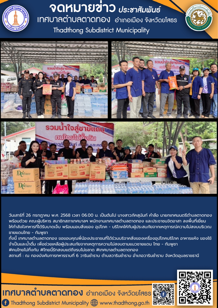 วันเสาร์ที่ 26 กรกฎาคม พ.ศ. 2568 เวลา 06.00 น. เป็นต้นไป นางสาวภัคสุนันท์ คำลือ นายกเทศมนตรีตำบลตาดทอง พร้อมด้วย คณะผู้บริหาร สมาชิกสภาเทศบาลฯ พนักงานเทศบาลตำบลตาดทอง และประชาชนจิตอาสา ลงพื้นที่เยี่ยมให้กำลังใจทหารที่ได้รับบาดเจ็บ พร้อมมอบสิ่งของ อุปโภค - บริโภคให้กับผู้ประสบภัยจากเหตุการณ์ความไม่สงบบริเวณชายแดนไทย - กัมพูชา