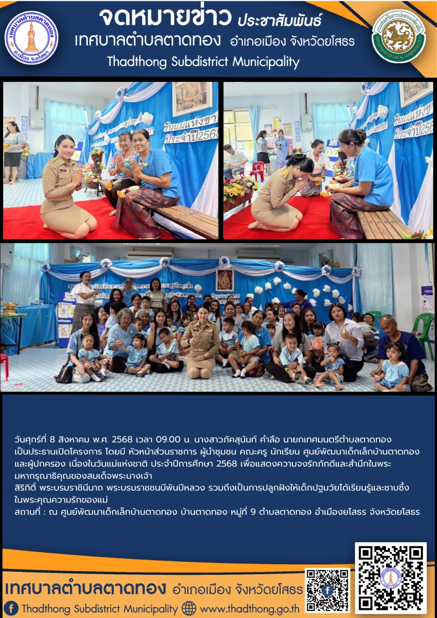 วันศุกร์ที่ 8 สิงหาคม พ.ศ. 2568 เวลา 09.00 น. นางสาวภัคสุนันท์ คำลือ นายกเทศมนตรีตำบลตาดทอง เป็นประธานเปิดโครงการ โดยมี หัวหน้าส่วนราชการ ผู้นำชุมชน คณะครู นักเรียน ศูนย์พัฒนาเด็กเล็กบ้านตาดทอง และผู้ปกครอง เนื่องในวันแม่แห่งชาติ ประจำปีการศึกษา 2568 เพื่อแสดงความจงรักภักดีและสำนึกในพระมหากรุณาธิคุณของสมเด็จพระนางเจ้า