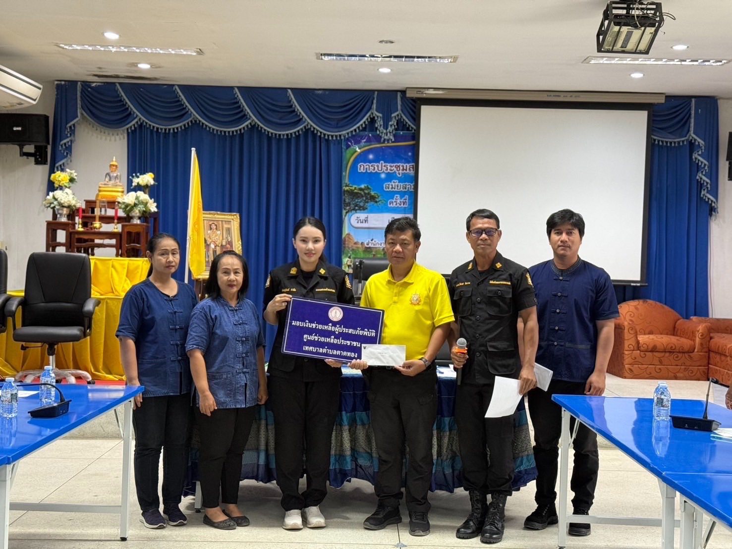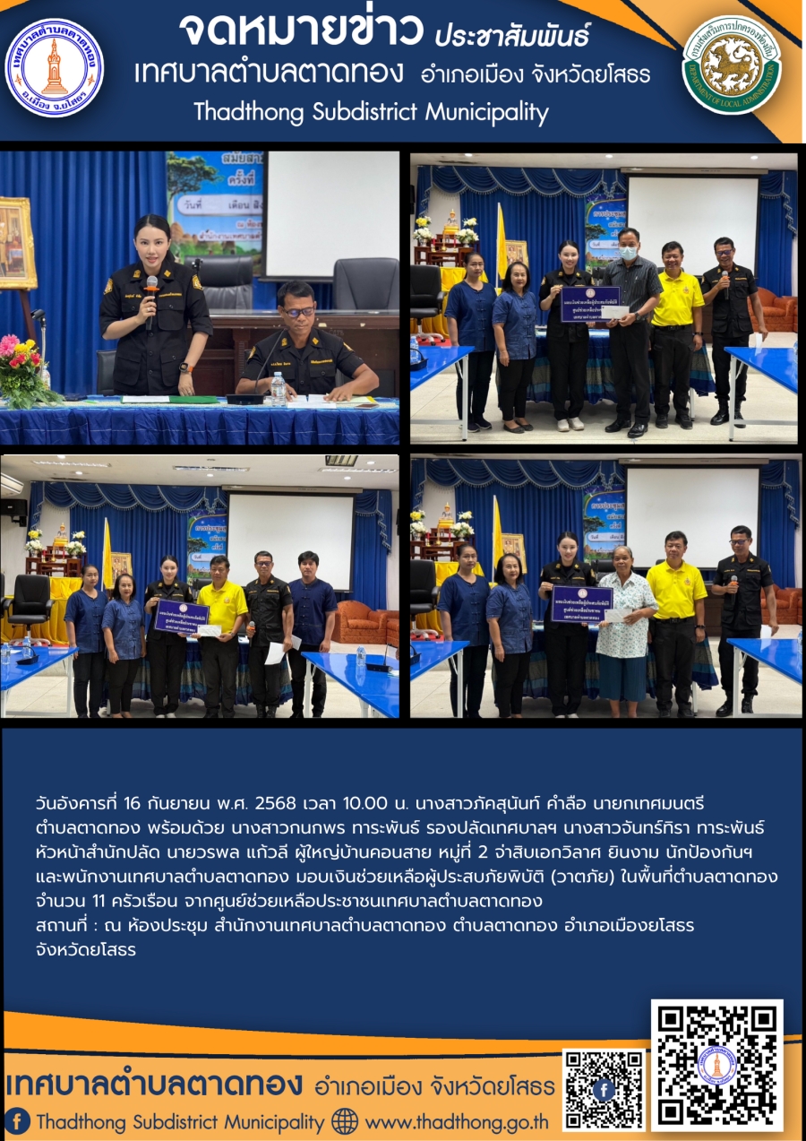 วันอังคารที่ 16 กันยายน พ.ศ. 2568 เวลา 10.00 น. นางสาวภัคสุนันท์ คำลือ นายกเทศมนตรีตําบลตาดทอง พร้อมด้วย นางสาวกนกพร ทาระพันธ์ รองปลัดเทศบาลฯ นางสาวจันทร์ทิรา ทาระพันธ์ หัวหน้าสำนักปลัด นายวรพล แก้วลี ผู้ใหญ่บ้านคอนสาย หมู่ที่ 2 จ่าสิบเอกวิลาศ ยินงาม นักป้องกันฯ และพนักงานเทศบาลตำบลตาดทอง มอบเงินช่วยเหลือผู้ประสบภัยพิบัติ (วาตภัย) ในพื้นที่ตำบลตาดทอง จำนวน 11 ครัวเรือน จากศูนย์ช่วยเหลือประชาชนเทศบาลตำบลตาดทอง