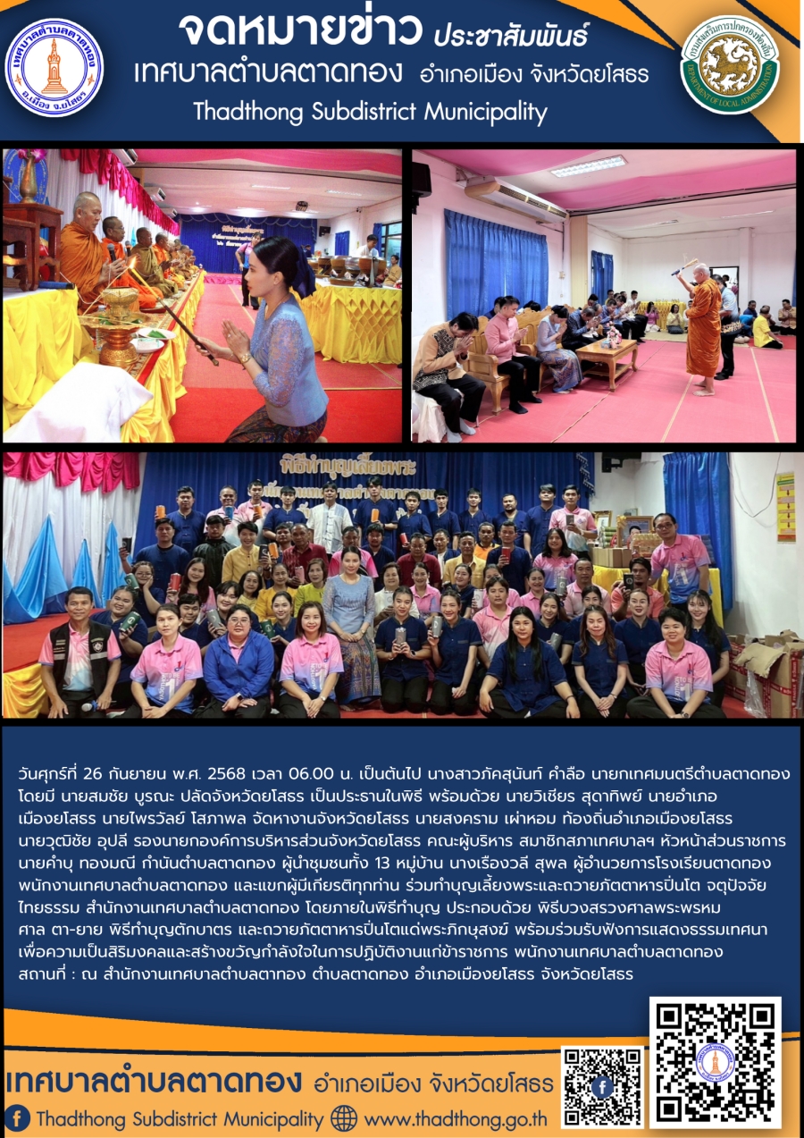 วันศุกร์ที่ 26 กันยายน พ.ศ. 2568 เวลา 06.00 น. เป็นต้นไป นางสาวภัคสุนันท์ คำลือ นายกเทศมนตรีตำบลตาดทอง โดยมี นายสมชัย บูรณะ ปลัดจังหวัดยโสธร เป็นประธานในพิธี พร้อมด้วย นายวิเชียร สุดาทิพย์ นายอำเภอเมืองยโสธร นายไพรวัลย์ โสภาพล จัดหางานจังหวัดยโสธร นายสงคราม เผ่าหอม ท้องถิ่นอำเภอเมืองยโสธร นายวุฒิชัย อุปลี รองนายกองค์การบริหารส่วนจังหวัดยโสธร คณะผู้บริหาร สมาชิกสภาเทศบาลฯ หัวหน้าส่วนราชการ นายคำบุ ทองมณี กำนันตำบลตาดทอง ผู้นำชุมชนทั้ง 13 หมู่บ้าน นางเรืองวลี สุพล ผู้อำนวยการโรงเรียนตาดทอง พนักงานเทศบาลตำบลตาดทอง และแขกผู้มีเกียรติทุกท่าน ร่วมทำบุญเลี้ยงพระและถวายภัตตาหารปิ่นโต จตุปัจจัย ไทยธรรม สำนักงานเทศบาลตำบลตาดทอง