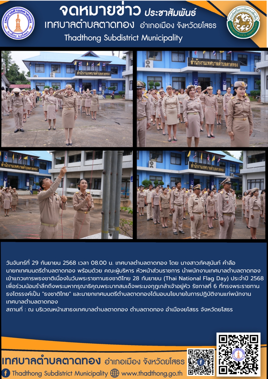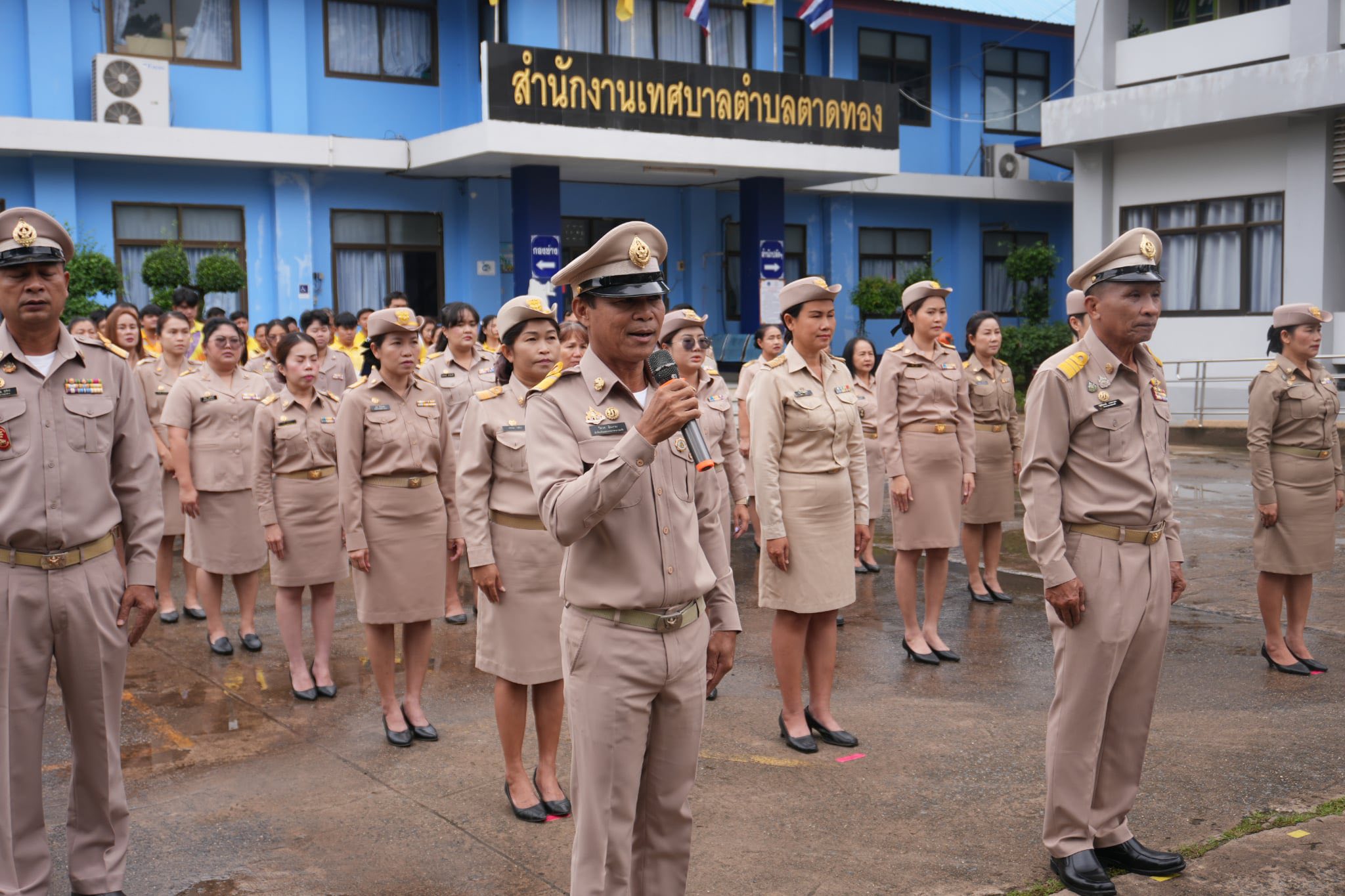 วันจันทร์ที่ 29 กันยายน 2568 เวลา 08.00 น. เทศบาลตำบลตาดทอง โดย นางสาวภัคสุนันท์ คำลือ นายกเทศมนตรีตำบลตาดทอง พร้อมด้วย คณะผู้บริหาร หัวหน้าส่วนราชการ นำพนักงานเทศบาลตำบลตาดทอง เข้าแถวเคารพธงชาติเนื่องในวันพระราชทานธงชาติไทย 28 กันยายน (Thai National Flag Day) ประจำปี 2568 เพื่อร่วมน้อมรำลึกถึงพระมหากรุณาธิคุณพระบาทสมเด็จพระมงกุฎเกล้าเจ้าอยู่หัว รัชกาลที่ 6 ที่ทรงพระราชทานธงไตรรงค์เป็น "ธงชาติไทย" และนายกเทศมนตรีตำบลตาดทองได้มอบนโยบายในการปฏิบัติงานแก่พนักงานเทศบาลตำบลตาดทอง