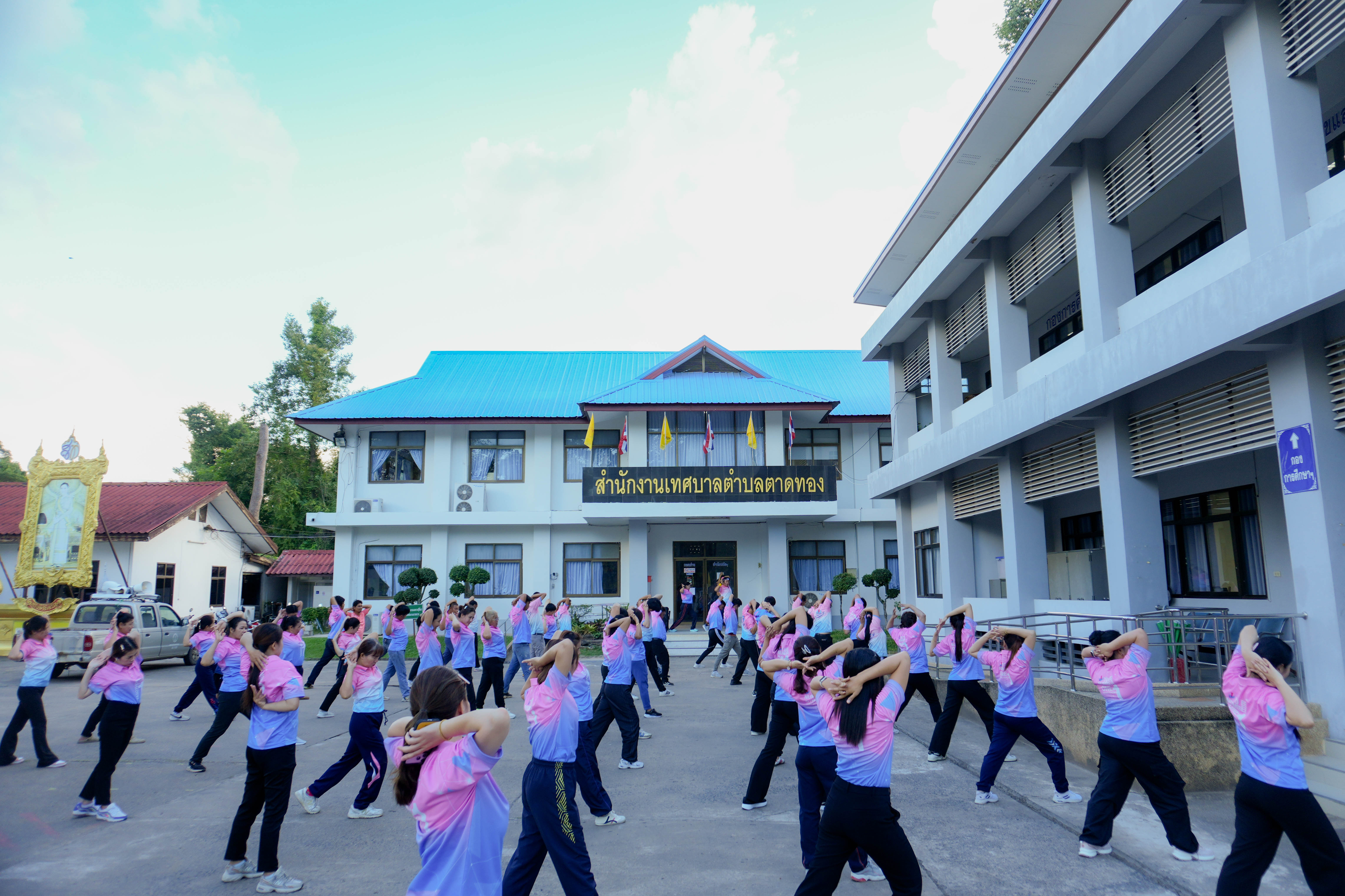 วันศุกร์ที่ 10 ตุลาคม พ.ศ. 2568 เวลา 16.00 น. นางสาวภัคสุนันท์ คำลือ นายกเทศมนตรีตำบลตาดทอง นำทีมออกกำลังกาย พร้อมด้วย คณะผู้บริหาร หัวหน้าส่วนราชการ พนักงานเทศบาลตำบลตาดทอง ร่วมกิจกรรมการออกกำลังกายเพื่อสุขภาพ หนึ่งในปัจจัยสำคัญที่จะช่วยส่งเสริมการมีสุขภาพที่แข็งแรง มีคุณภาพชีวิตที่ดี เพื่อสร้างเสริมสุขภาวะบุคลากรเทศบาลตำบลตาดทอง