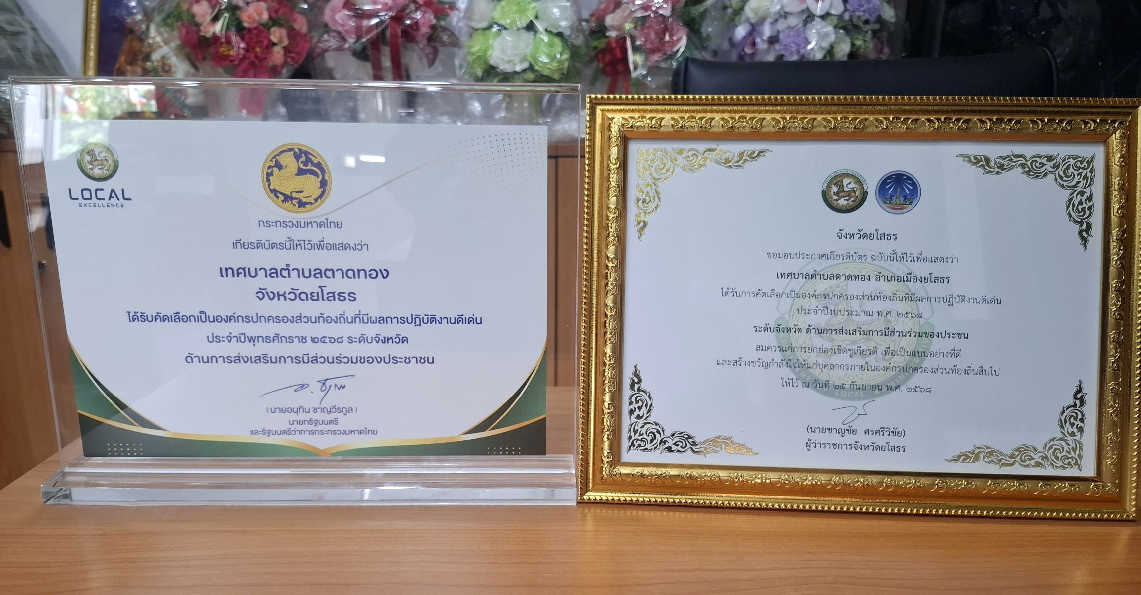 3.เทศบาลตำบลตาดทอง รับมอบใบประกาศเกียรติบัตร ระดับจังหวัด ด้านการส่งเสริมการมีส่วนร่วมของประชาชน