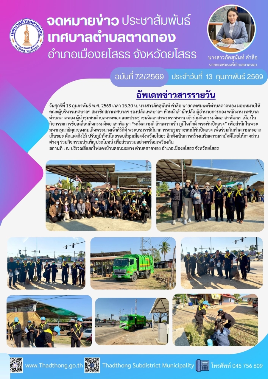 วันศุกร์ที่ 13 กุมภาพันธ์ พ.ศ. 2569 เวลา 15.30 น. นางสาวภัคสุนันท์ คำลือ นายกเทศมนตรีตำบลตาดทอง มอบหมายให้ คณะผู้บริหารเทศบาลฯ สมาชิกสภาเทศบาลฯ รองปลัดเทศบาลฯ หัวหน้าสำนักปลัด ผู้อำนวยการกอง พนักงาน เทศบาลตําบลตาดทอง ผู้นำชุมชนตำบลตาดทอง และประชาชนจิตอาสาพระราชทาน เข้าร่วมกิจกรรมจิตอาสาพัฒนา เนื่องในกิจกรรมการขับเคลื่อนกิจกรรมจิตอาสาพัฒนา “หนึ่งความดี ล้านความรัก ภูมิใจภักดิ์ พระพันปีหลวง” เพื่อสำนึกในพระมหากรุณาธิคุณของสมเด็จพระนางเจ้าสิริกิติ์ พระบรมราชินีนาถ พระบรมราชชนนีพันปีหลวง เพื่อร่วมกันทำความสะอาด เก็บขยะ ตัดแต่งกิ่งไม้ ปรับภูมิทัศน์โดยรอบสี่มุมเมืองจังหวัดยโสธร อีกทั้งเป็นการสร้างเสริมความสามัคคีโดยให้ภาคส่วนต่างๆ ร่วมกิจกรรมบำเพ็ญประโยชน์ เพื่อส่วนรวมอย่างพร้อมเพรียงกัน