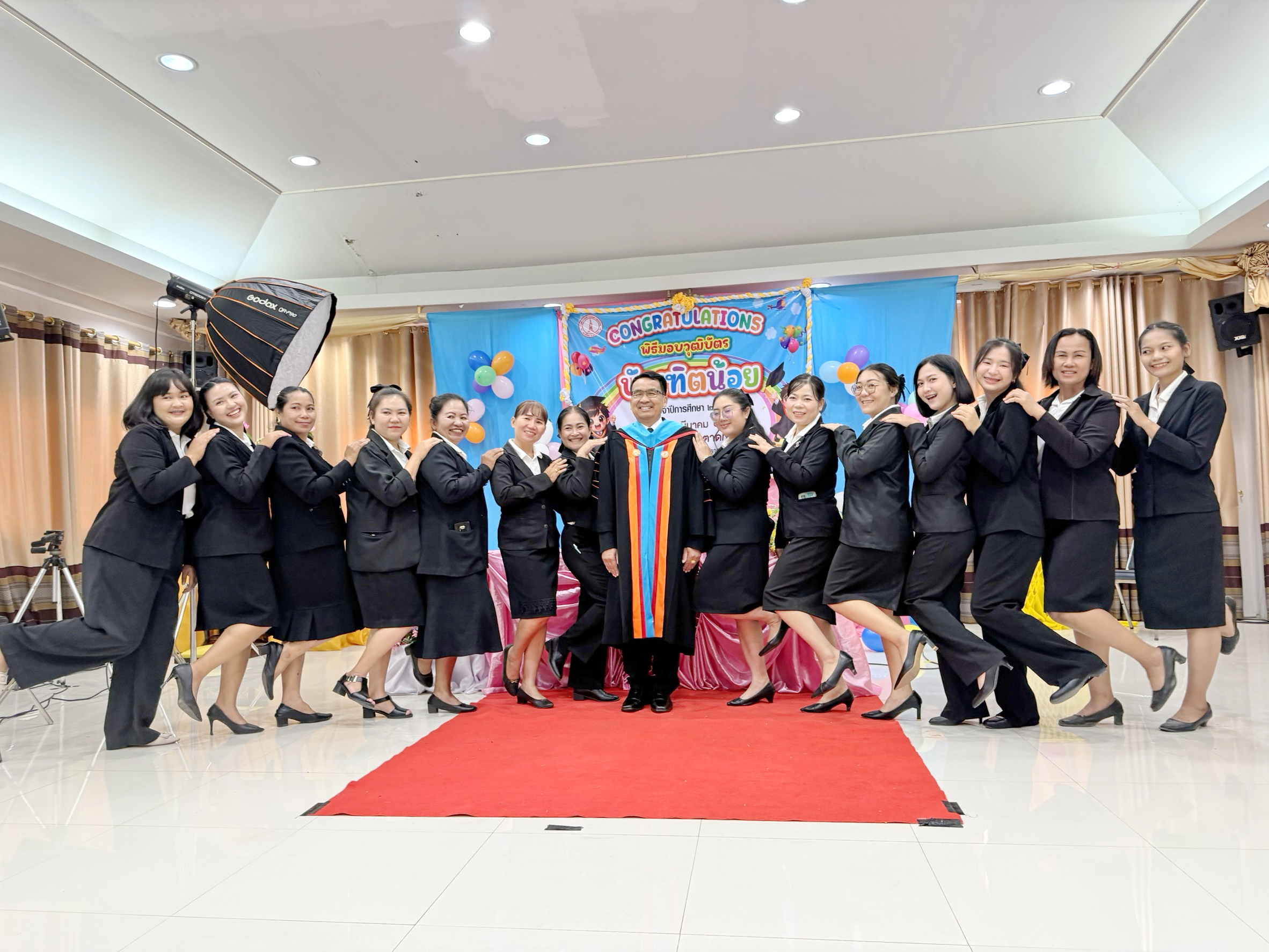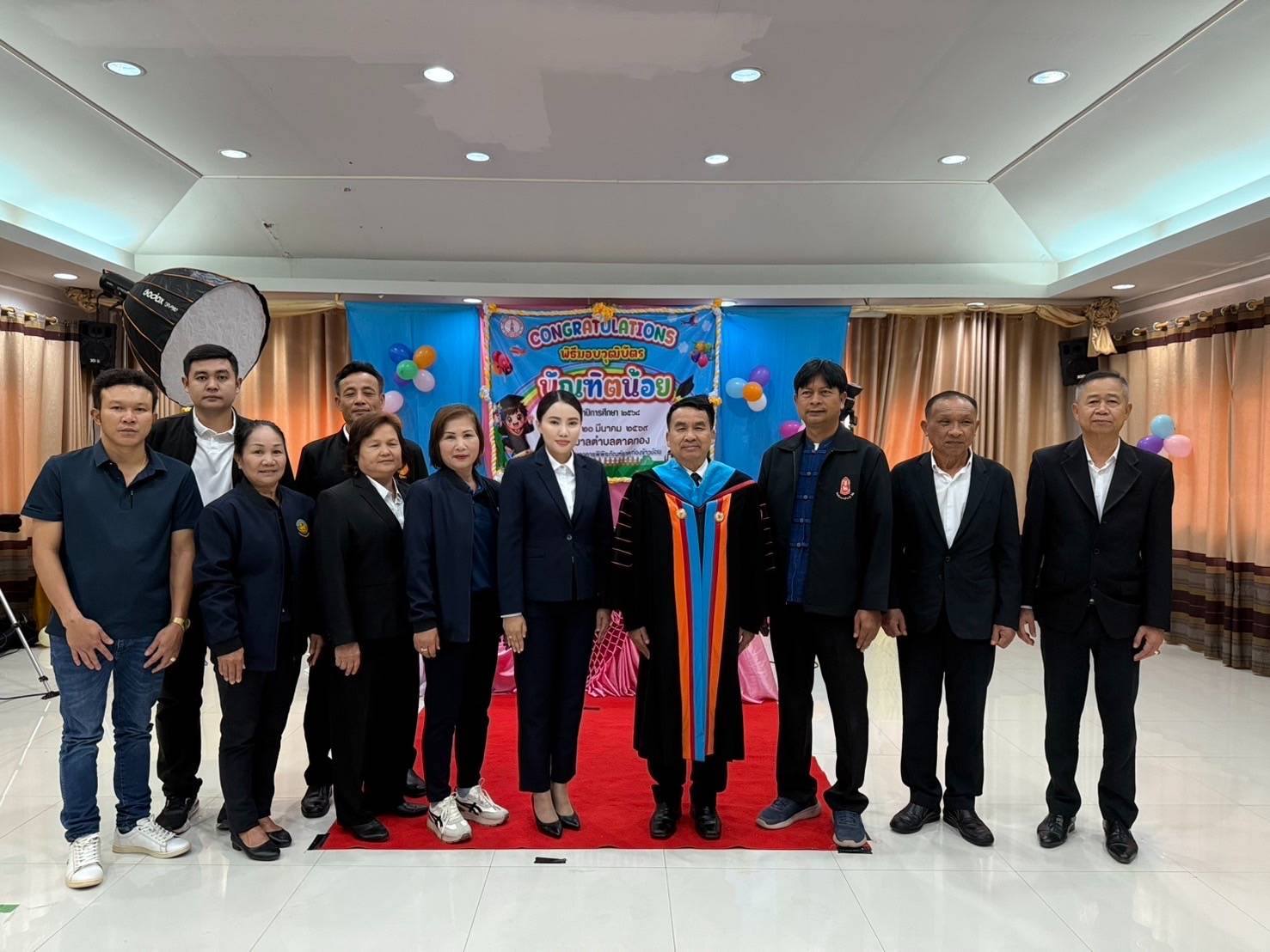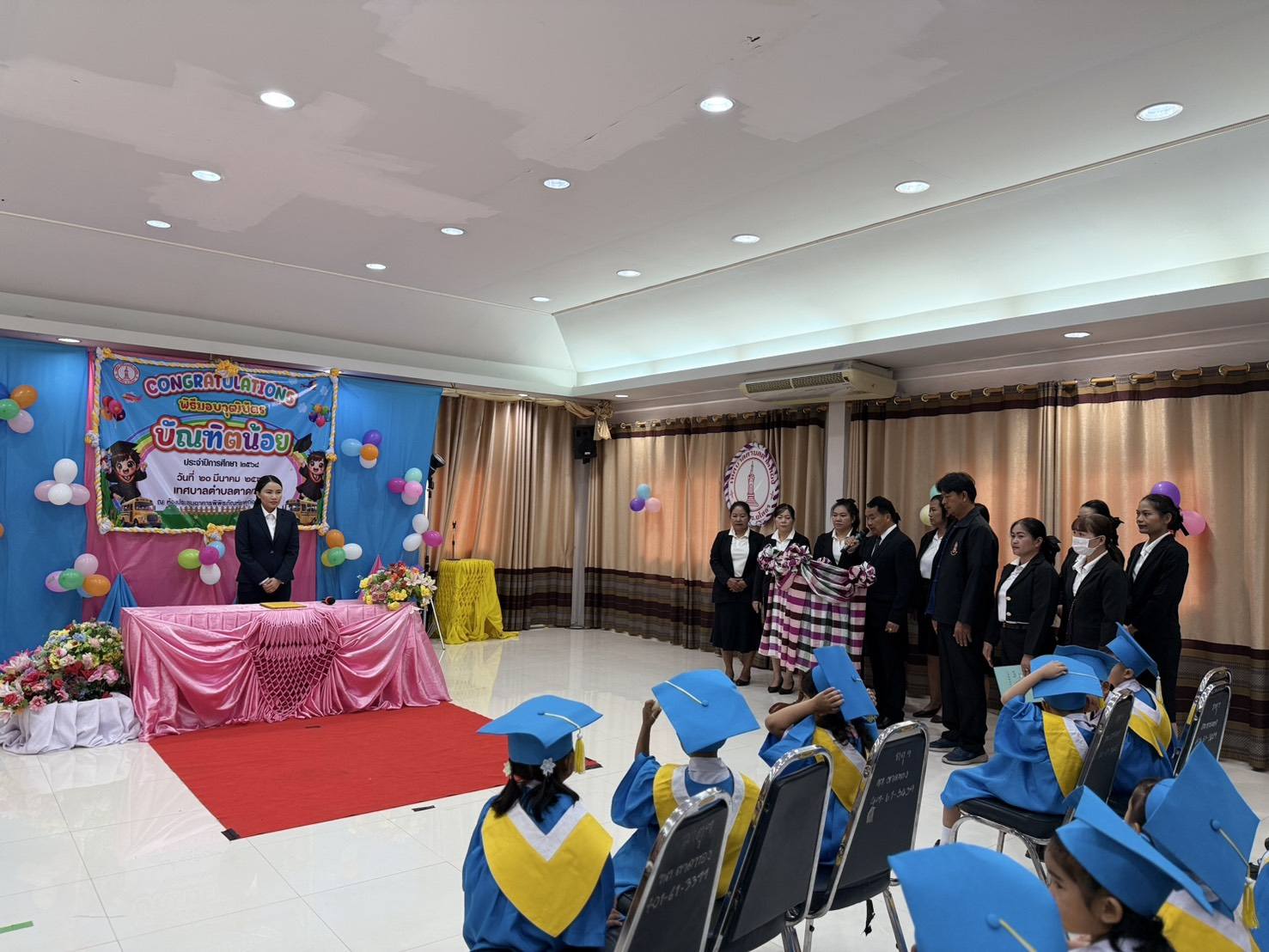 วันศุกร์ที่ 20 มีนาคม พ.ศ.2569 เวลา 09.45 น. นางสาวภัคสุนันท์ คำลือ นายกเทศมนตรีตำบลตาดทอง ประธานในพิธีเปิด กิจกรรมวันแห่งความสำเร็จ (บัณฑิตน้อย) ประจำปี 2568 โดยมี ว่าที่ร้อยตรีพิชิต กันยาวรรณ ปลัดเทศบาลตำบลตาดทอง เป็นผู้กล่าวรายงาน พร้อมด้วย คณะผู้บริหารเทศบาลฯ สมาชิกสภาเทศบาลฯ หัวหน้าส่วนราชการ ครู ผู้ดูแลเด็กและบุคลากรทางการศึกษา ผู้นำชุมชน พนักงานเทศบาลฯ ผู้ปกครองนักเรียน แขกผู้เกียรติและคณะกรมการผู้บริหารสถานศึกษาทั้งสามศูนย์ในสังกัดเทศบาลตำบลตาดทองที่มาร่วมงานในวันนี้ หลังจากเสร็จพิธีเปิดประธานในพิธีฯ ได้มอบหมายให้ว่าที่ร้อยตรีพิชิต กันยาวรรณ ปลัดเทศบาลตำบลตาดทอง เป็นผู้มอบวุฒิบัตรให้กับเด็กนักเรียนศูนย์พัฒนาเด็กเล็กในสังกัดเทศบาลตำบลตาดทอง ทั้ง 3 แห่ง ที่สำเร็จการศึกษา เนื่องในวันแห่งความสำเร็จ (บัณฑิตน้อย) ประจำปี 2568 วัตถุประสงค์เพื่อส่งเสริมให้เด็กกล้าแสดงออกและเป็นการสร้างขวัญและกำลังใจให้กับเด็กเล็กที่ผ่านการเตรียมความพร้อมในศูนย์พัฒนาเด็กเล็ก ตามหลักสูตร การศึกษาปฐมวัย พุทธศักราช 2560 ให้มีความมุ่งมั่นศึกษาเล่าเรียนในระดับที่สูงขึ้นไป