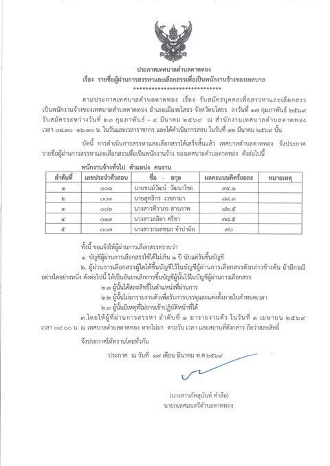 รายชื่อผู้ผ่านการสรรหาและเลือกสรรเพื่อเป็นพนักงานจ้างของเทศบาล วันอังคาร, 17 มีนาคม 2569 08:51 Print Email ดาวน์โหลดเอกสาร รายชื่อผู้ผ่านการสรรหาและเลือกสรรเพื่อเป็นพนักงานจ้างของเทศบาล (0 Downloads) back to top